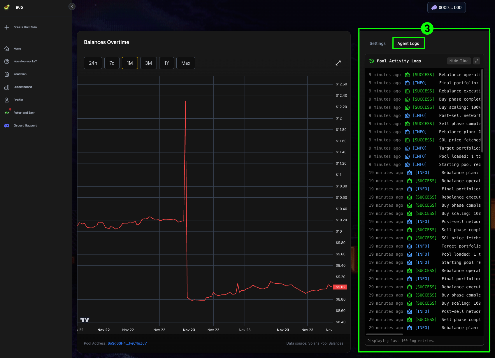 Select an agent from the Profile Page to access the Agent Pool page, where you can customize, view details, and manage your positions including adding or reducing them.