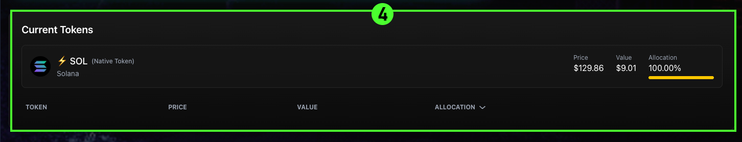 Shows tokens currently held in the Agent Pool, including their allocation percentages and total monetary value.