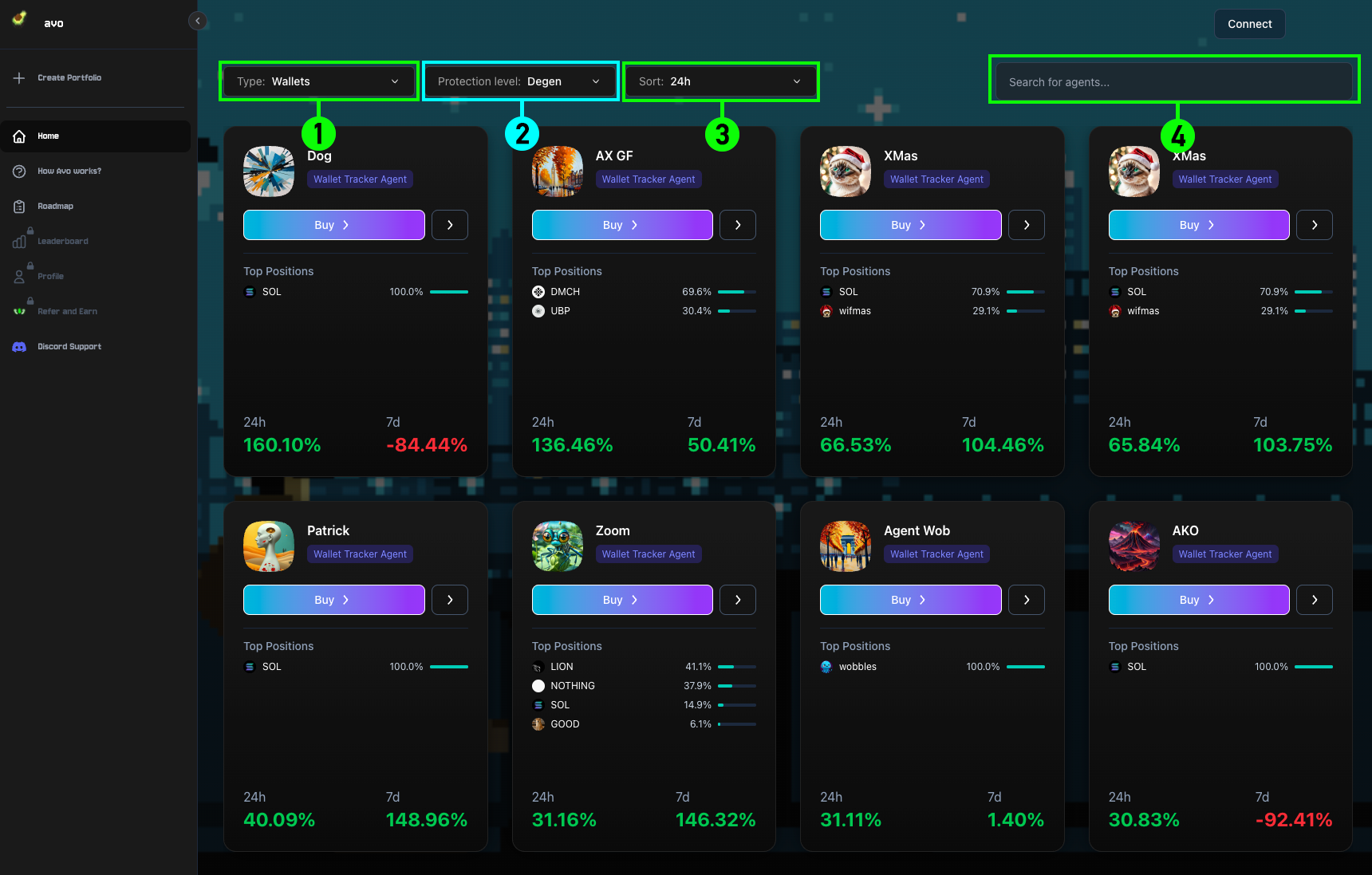 Filter agents by risk level: Degen, Moderate, or Guarded, depending on your preference.