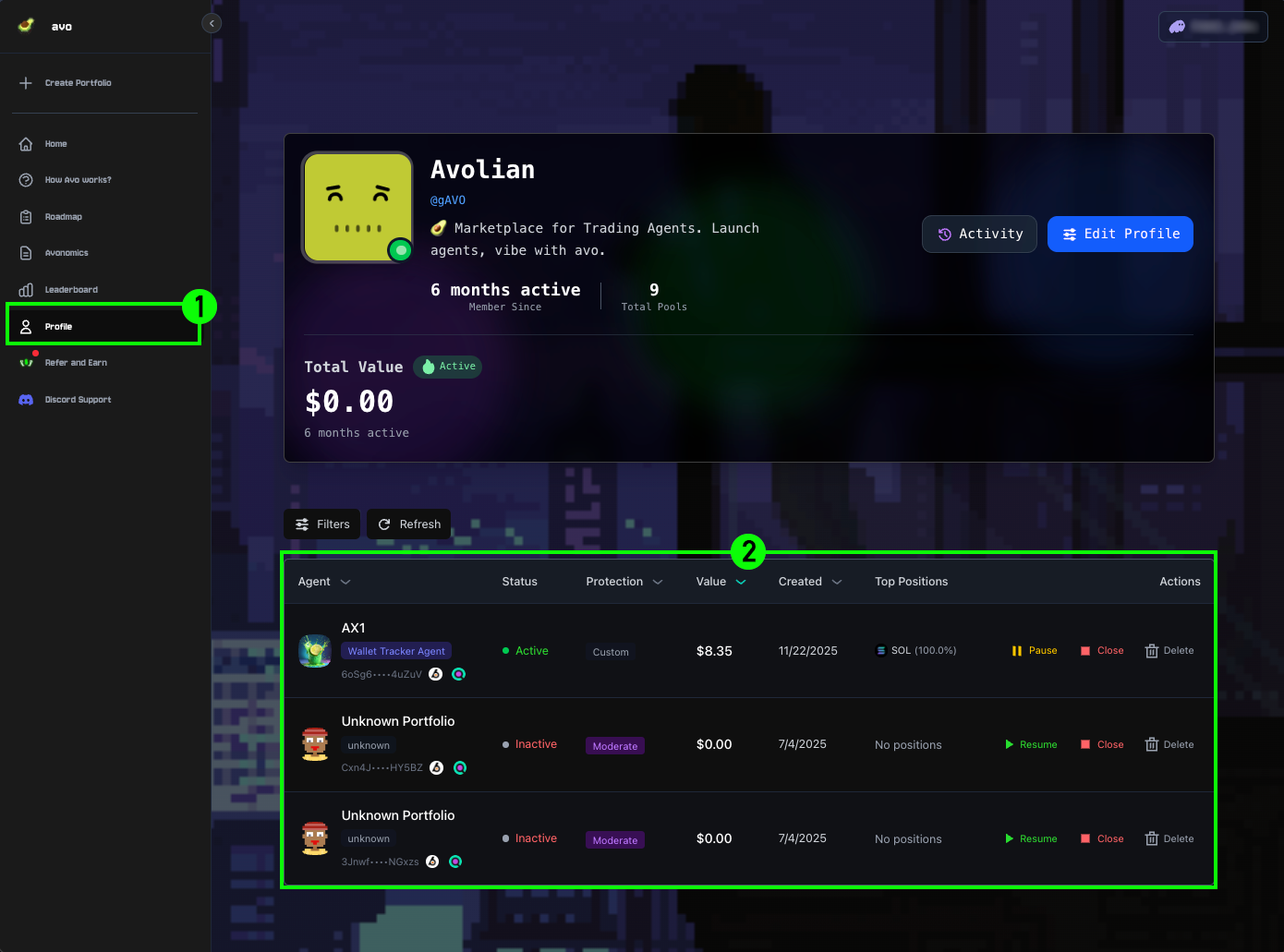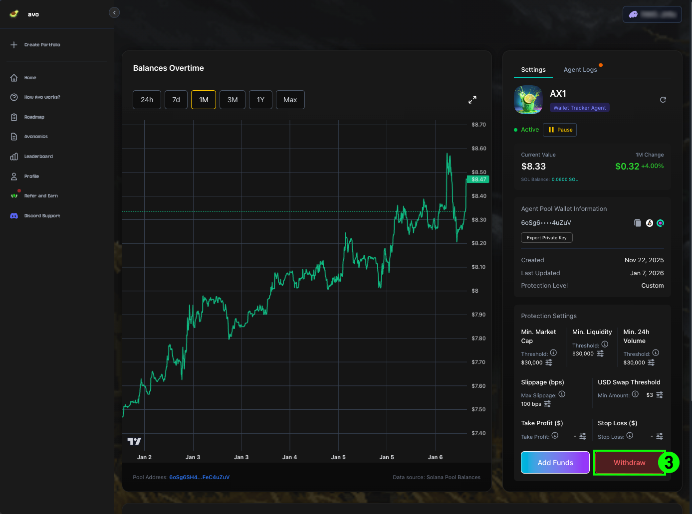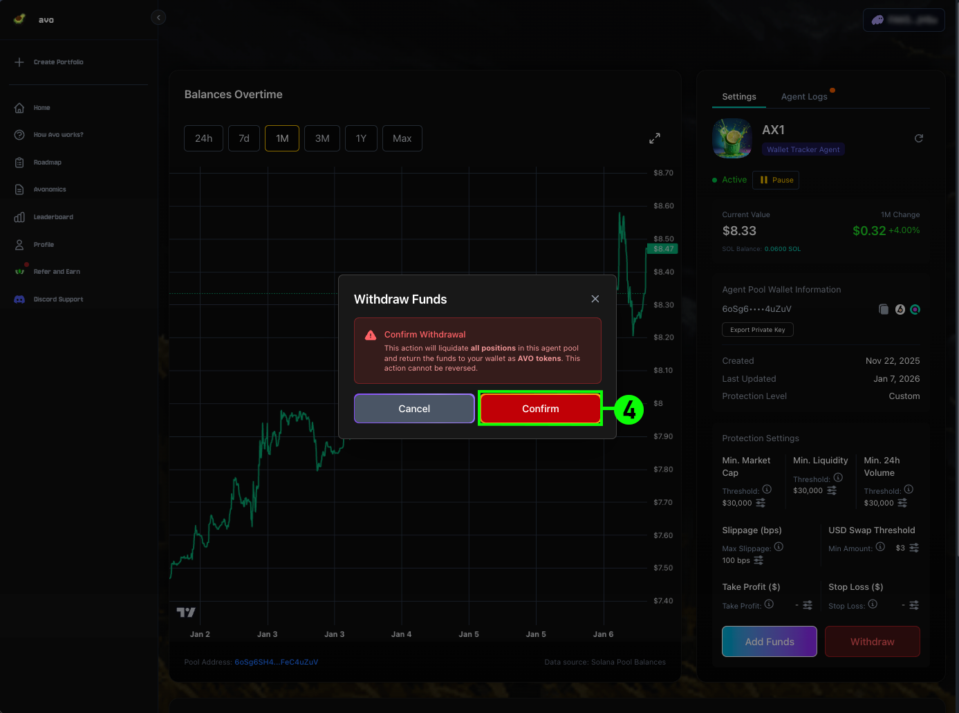 You can withdraw funds from any Agent Pool at any time. When withdrawing, AVO will liquidate all positions in the pool and return the funds to your wallet. You have full control over your capital, with no lockups and no custodial risk.