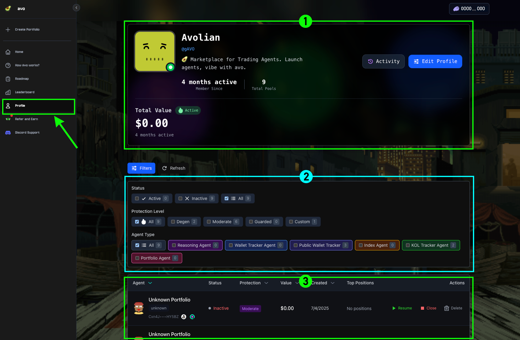 Manage your agents via the Profile Page. The page contains three primary sections: